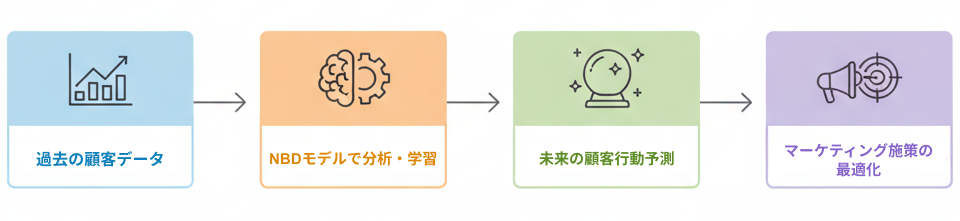 NBDモデルは、**「過去の購買履歴から顧客が将来どれくらい購入するか」**を確率的に推定する手法です。