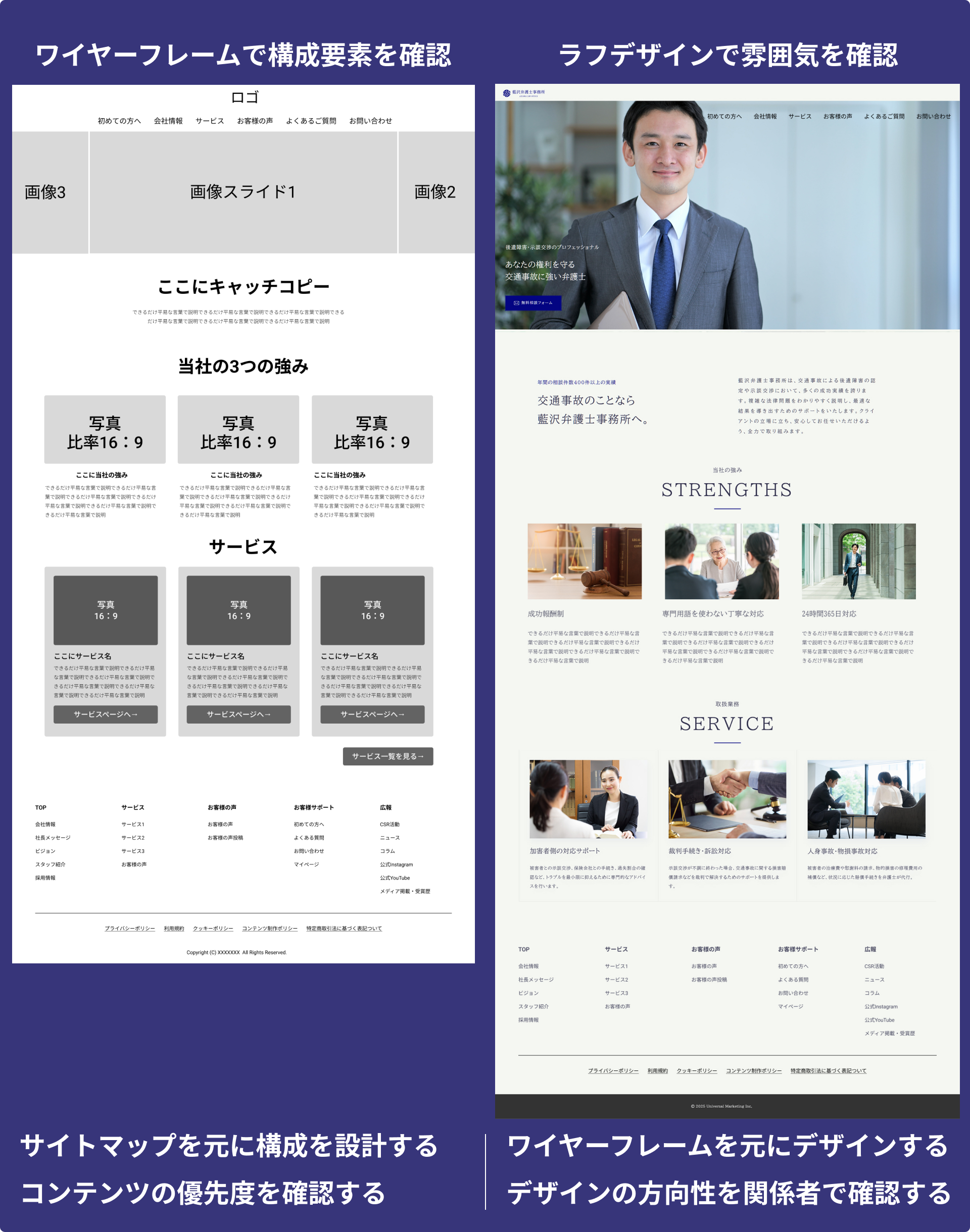 特にデザインにこだわるサイトの場合デザインのやり直しはかなりのコストがかかります。それを避けるためにも上流工程のサイトマップ→コンテンツマップ→ワイヤーフレームの手順を守りましょう。