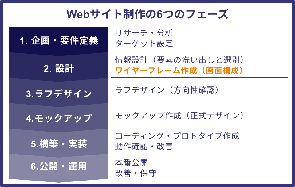ワイヤーフレームは上図の「2. 設計」フェーズで作成します。各フェーズの詳細は次のとおりです。