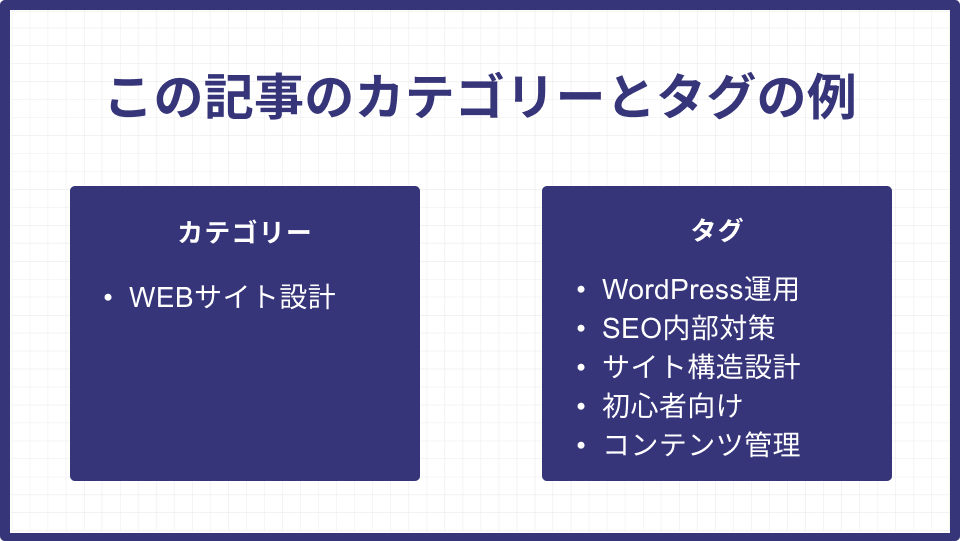 カテゴリーはサイト全体の主要テーマごとに設定し、タグは記事の細分化に利用します。
